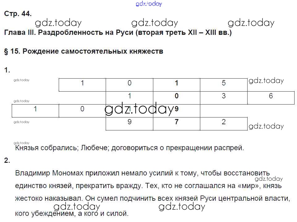 На страницах сайта gdz.today вы найдете учебный и вспомогательный материал, направленный на улучшения знаний школьной программы. ГДЗ - онлайн мир знаний Страницы (решение) 44 Рабочей тетради по Истории России для 6 класса Баранов Вентана-граф Алгоритм успеха 2017