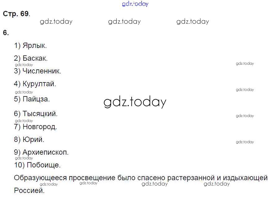 На страницах сайта gdz.today вы найдете учебный и вспомогательный материал, направленный на улучшения знаний школьной программы. ГДЗ - онлайн мир знаний Страницы (решение) 69 Рабочей тетради по Истории России для 6 класса Баранов Вентана-граф Алгоритм успеха 2017