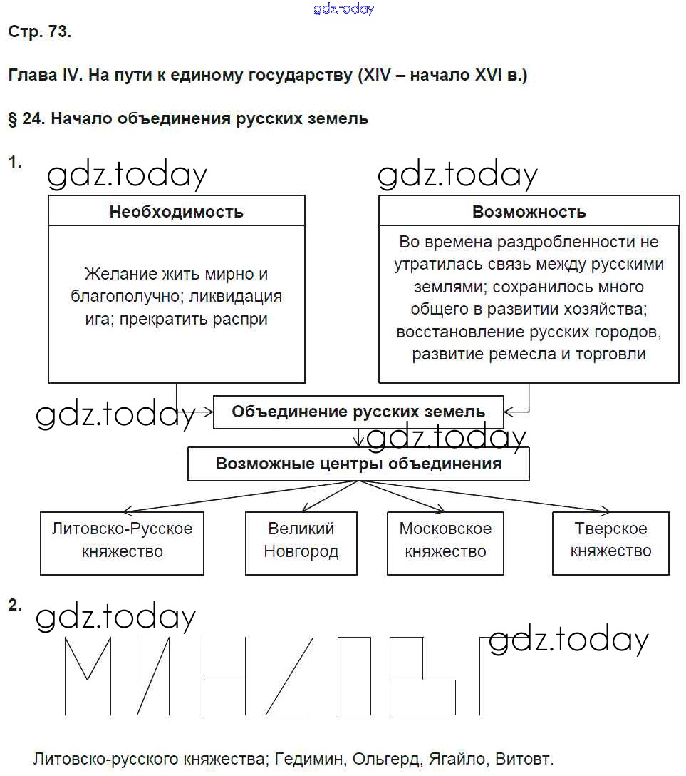 На страницах сайта gdz.today вы найдете учебный и вспомогательный материал, направленный на улучшения знаний школьной программы. ГДЗ - онлайн мир знаний Страницы (решение) 73 Рабочей тетради по Истории России для 6 класса Баранов Вентана-граф Алгоритм успеха 2017