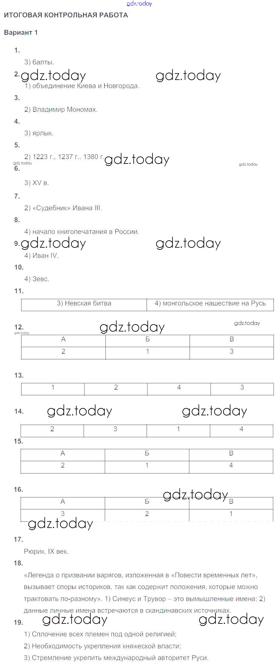 На страницах сайта gdz.today вы найдете учебный и вспомогательный материал, направленный на улучшения знаний школьной программы. ГДЗ - онлайн мир знаний Итоговая контрольная работа (решение) Вариант-1 Тематическому контролю по Истории России для 6 класса Артасов, Гаврилина Национальное образование 2015