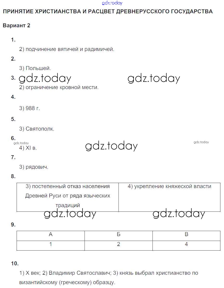 Ответы к СР-№2. Принятие христианства и расцвет Древнерусского государства Русь Древняя (решение) Вариант-2 Тематическому контролю по Истории России для 6 класса Артасов, Гаврилина Национальное образование 2015