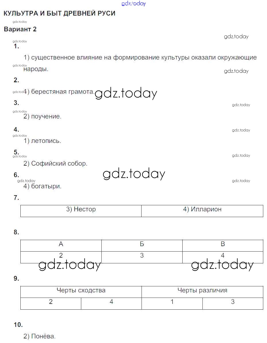 Ответы к СР-№3. Культура и быт Древней Руси Русь Древняя (решение) Вариант-2 Тематическому контролю по Истории России для 6 класса Артасов, Гаврилина Национальное образование 2015