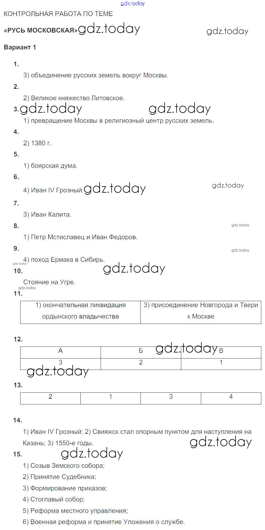 На страницах сайта gdz.today вы найдете учебный и вспомогательный материал, направленный на улучшения знаний школьной программы. ГДЗ - онлайн мир знаний КР. Русь Московская Русь Московская (решение) Вариант-1 Тематическому контролю по Истории России для 6 класса Артасов, Гаврилина Национальное образование 2015