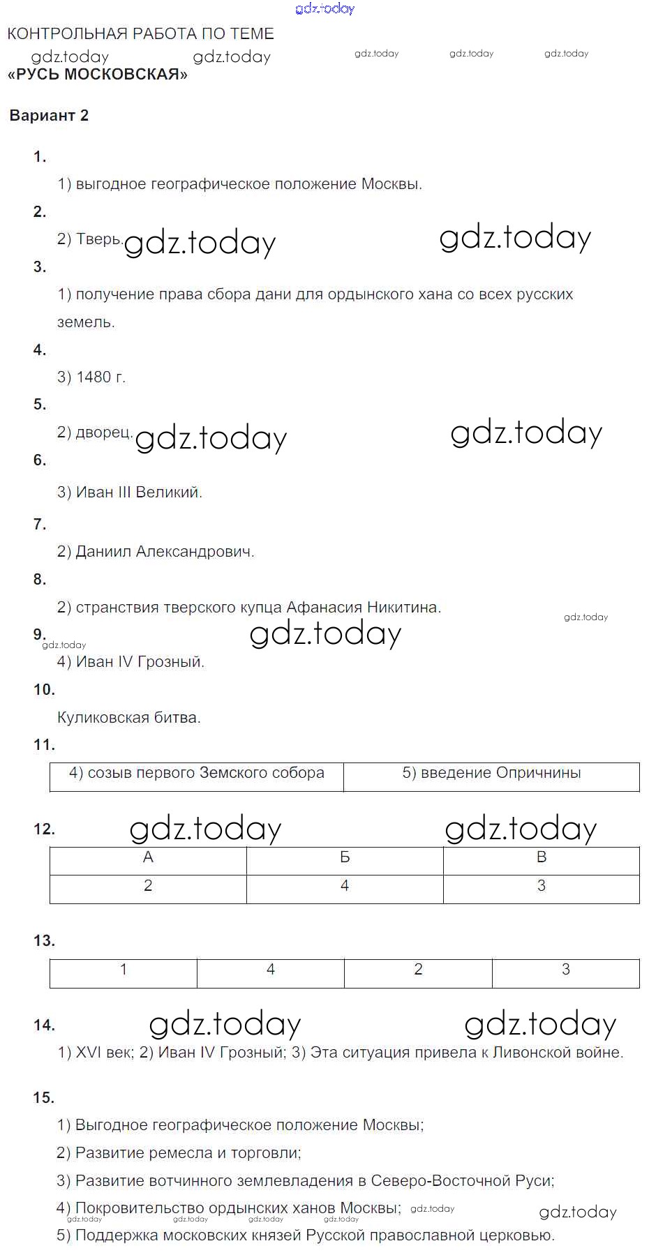Ответы к КР. Русь Московская Русь Московская (решение) Вариант-2 Тематическому контролю по Истории России для 6 класса Артасов, Гаврилина Национальное образование 2015