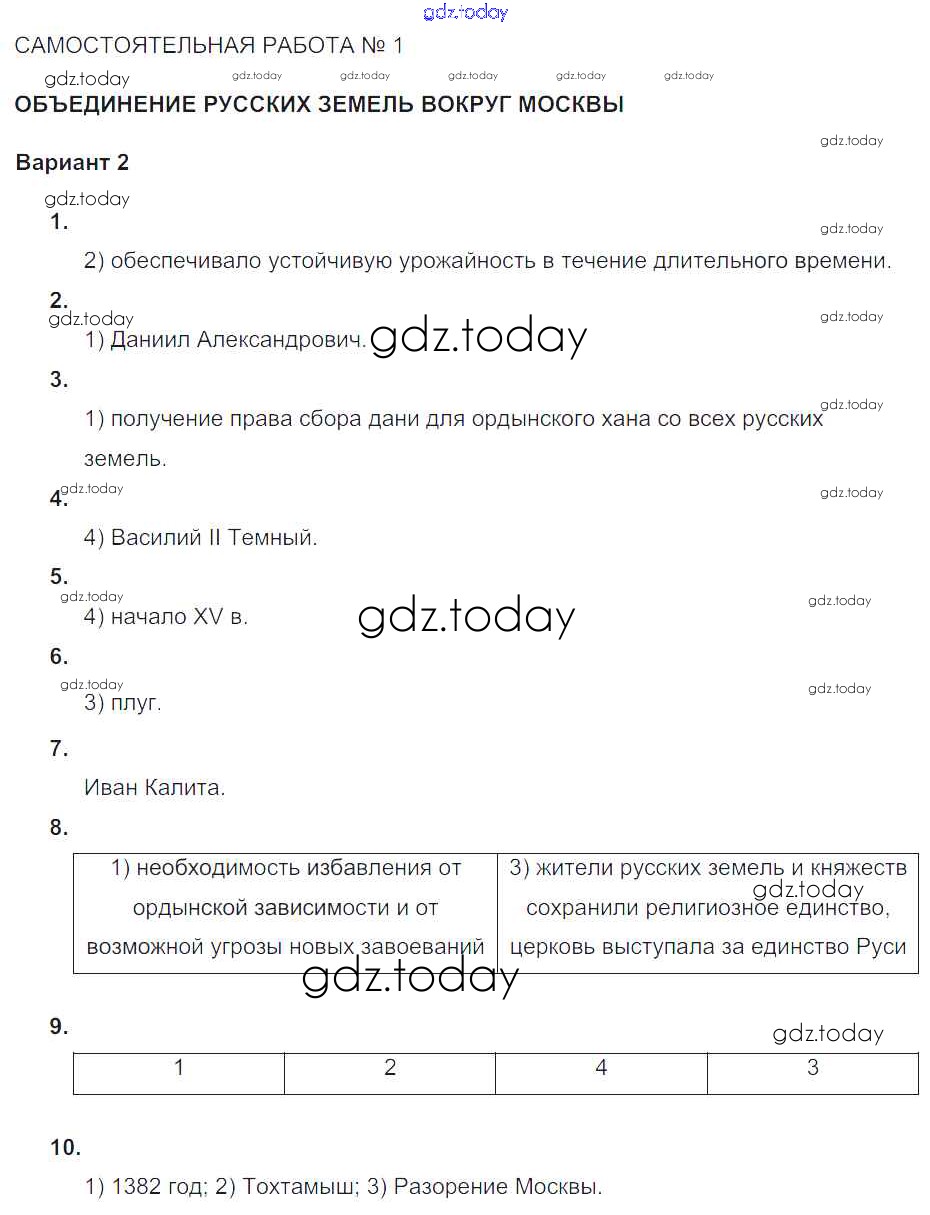 Ответы к СР-№1. Объединение русских земель вокруг Москвы Русь Московская (решение) Вариант-2 Тематическому контролю по Истории России для 6 класса Артасов, Гаврилина Национальное образование 2015