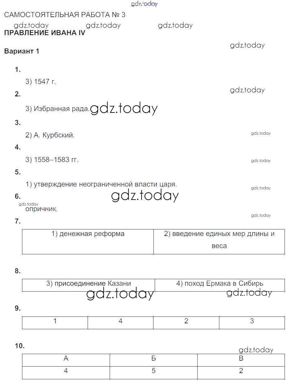 Ответы к СР-№3. Правление Иоана IV Русь Московская (решение) Вариант-1 Тематическому контролю по Истории России для 6 класса Артасов, Гаврилина Национальное образование 2015