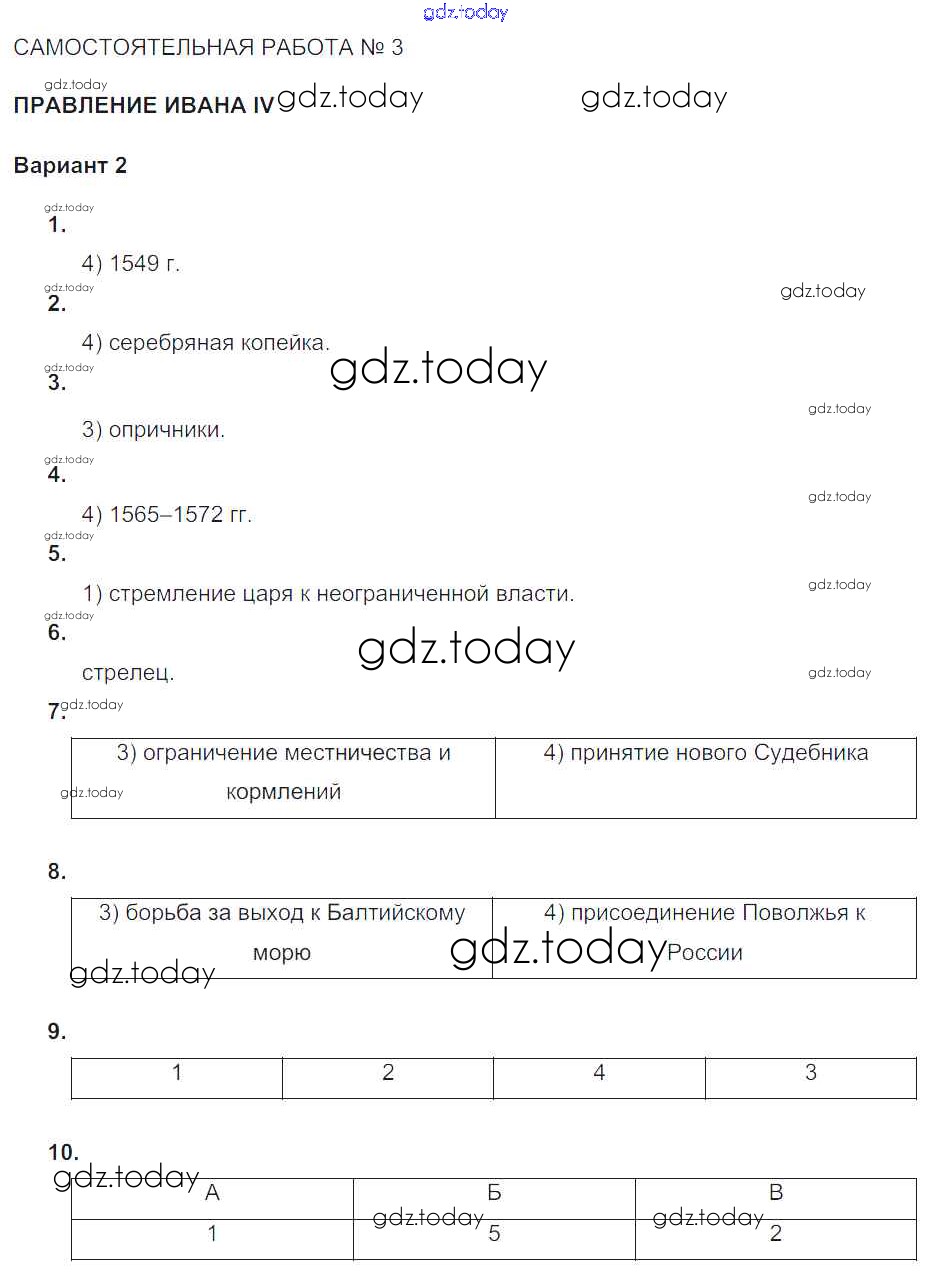 Ответы к СР-№3. Правление Иоана IV Русь Московская (решение) Вариант-2 Тематическому контролю по Истории России для 6 класса Артасов, Гаврилина Национальное образование 2015