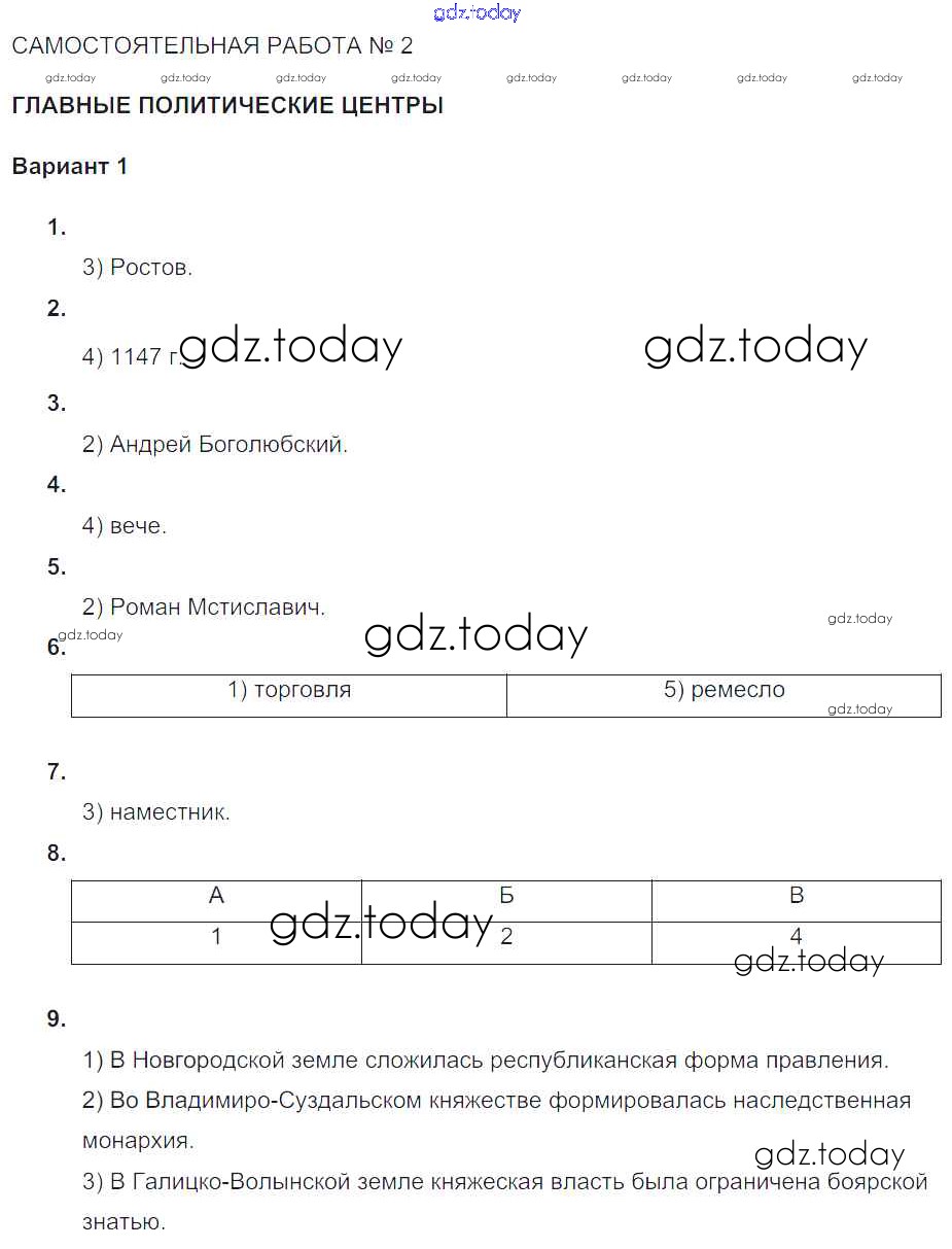 На страницах сайта gdz.today вы найдете учебный и вспомогательный материал, направленный на улучшения знаний школьной программы. ГДЗ - онлайн мир знаний СР-№2. Главные политические центры Формирование самостоятельных государственных образований на Руси (решение) Вариант-1 Тематическому контролю по Истории России для 6 класса Артасов, Гаврилина Национальное образование 2015