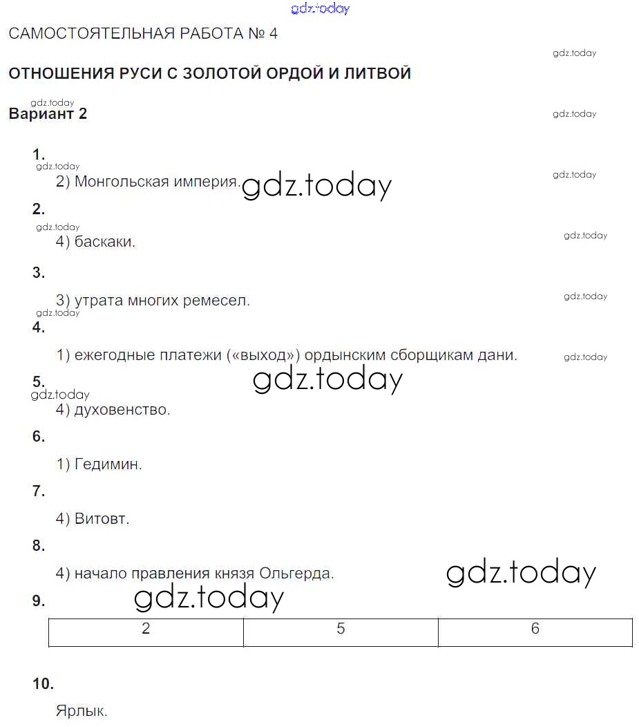 Ответы к СР-№4. Отношения Руси с Золотой Ордой и Литвой Формирование самостоятельных государственных образований на Руси (решение) Вариант-2 Тематическому контролю по Истории России для 6 класса Артасов, Гаврилина Национальное образование 2015