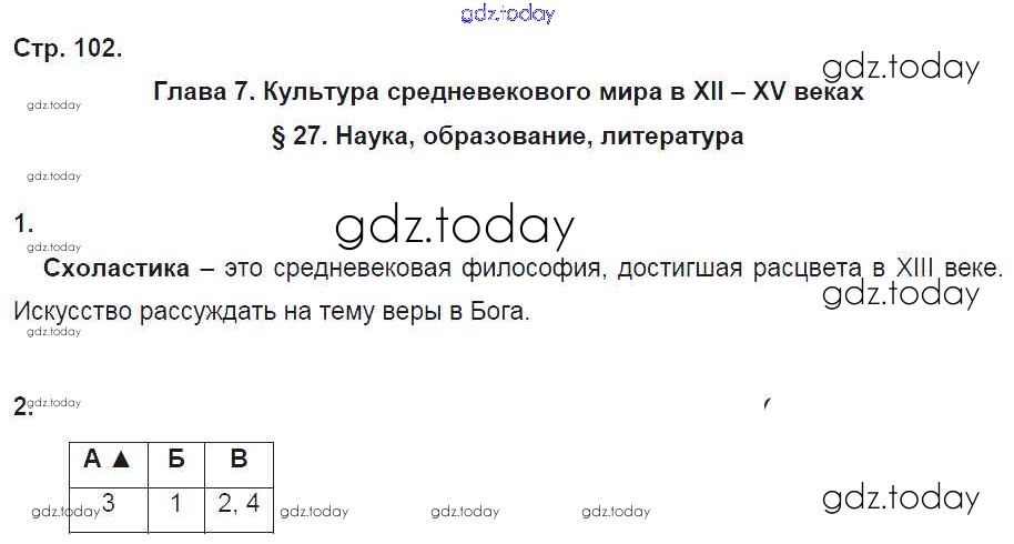 На страницах сайта gdz.today вы найдете учебный и вспомогательный материал, направленный на улучшения знаний школьной программы. ГДЗ - онлайн мир знаний Страницы (решение) 102 Рабочей тетради по Истории для 6 класса Баранов Вентана-граф Алгоритм успеха 2017