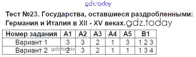 Ответы к Решение к тестам Тест №23. Государства, оставшиеся раздробленными - Германия и Италия в XII - XV веках Контрольно-измерительным материалам (КИМ) по Истории для 6 класса Чернова Экзамен 2015