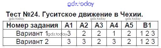 Ответы к Решение к тестам Тест №24. Гуситское движение в Чехии Контрольно-измерительным материалам (КИМ) по Истории для 6 класса Чернова Экзамен 2015