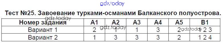 Ответы к Решение к тестам Тест №25. Завоевание турками-османами Балканского полуострова Контрольно-измерительным материалам (КИМ) по Истории для 6 класса Чернова Экзамен 2015