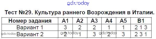 Ответы к Решение к тестам Тест №29. Культура раннего Возрождения в Италии Контрольно-измерительным материалам (КИМ) по Истории для 6 класса Чернова Экзамен 2015