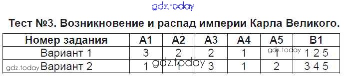 На страницах сайта gdz.today вы найдете учебный и вспомогательный материал, направленный на улучшения знаний школьной программы. ГДЗ - онлайн мир знаний Решение к тестам Тест №3. Возникновение и распад империи Карла Великого Контрольно-измерительным материалам (КИМ) по Истории для 6 класса Чернова Экзамен 2015