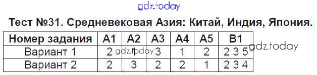 Ответы к Решение к тестам Тест №31. Средневековая Азия - Китай, Индия, Япония Контрольно-измерительным материалам (КИМ) по Истории для 6 класса Чернова Экзамен 2015