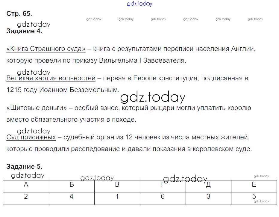 На страницах сайта gdz.today вы найдете учебный и вспомогательный материал, направленный на улучшения знаний школьной программы. ГДЗ - онлайн мир знаний Страницы (решение) 65 Рабочей тетради по Истории для 6 класса Чернова Экзамен УМК 2015