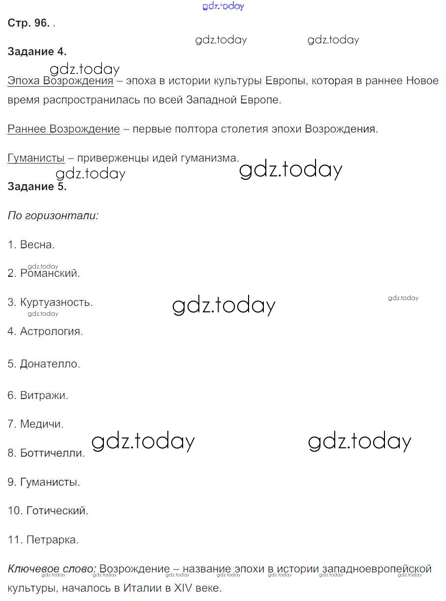 На страницах сайта gdz.today вы найдете учебный и вспомогательный материал, направленный на улучшения знаний школьной программы. ГДЗ - онлайн мир знаний Страницы (решение) 96 Рабочей тетради по Истории для 6 класса Чернова Экзамен УМК 2015