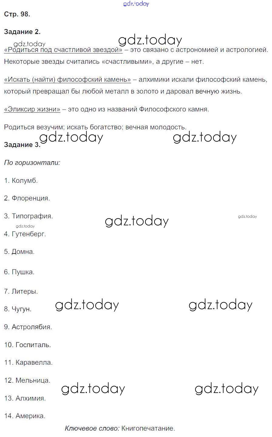 На страницах сайта gdz.today вы найдете учебный и вспомогательный материал, направленный на улучшения знаний школьной программы. ГДЗ - онлайн мир знаний Страницы (решение) 98 Рабочей тетради по Истории для 6 класса Чернова Экзамен УМК 2015