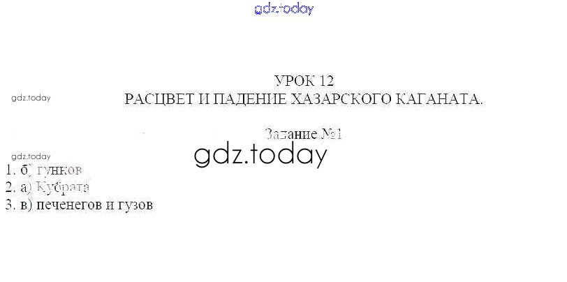 На страницах сайта gdz.today вы найдете учебный и вспомогательный материал, направленный на улучшения знаний школьной программы. ГДЗ - онлайн мир знаний Решение к уроку № 12. Расцвет и падение Хазарского каганата 1 Рабочей тетради по Кубановедению для 6 класса Голикова, Морозова Традиция 2019