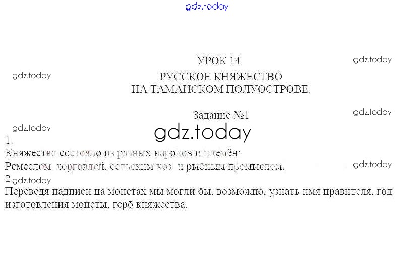 На страницах сайта gdz.today вы найдете учебный и вспомогательный материал, направленный на улучшения знаний школьной программы. ГДЗ - онлайн мир знаний Решение к уроку № 14. Русское княжество на Таманском полуострове 1 Рабочей тетради по Кубановедению для 6 класса Голикова, Морозова Традиция 2019