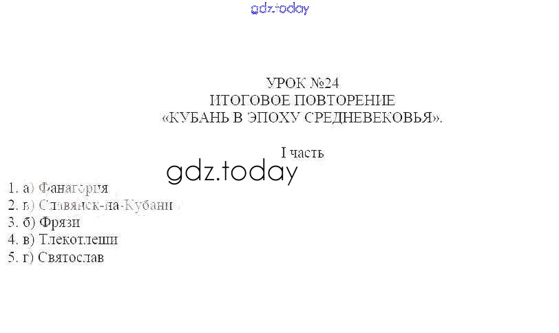 На страницах сайта gdz.today вы найдете учебный и вспомогательный материал, направленный на улучшения знаний школьной программы. ГДЗ - онлайн мир знаний Решение к уроку № 24. Итоговое повторение «Кубань в эпоху Средневековья» Часть 1 Рабочей тетради по Кубановедению для 6 класса Голикова, Морозова Традиция 2019