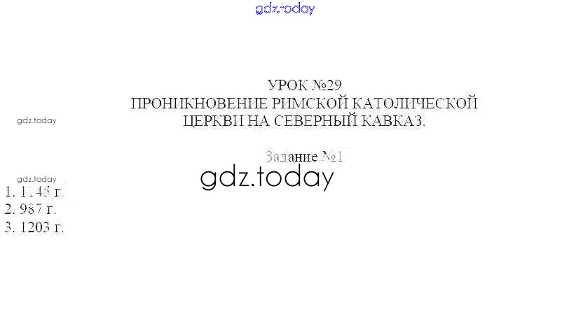 На страницах сайта gdz.today вы найдете учебный и вспомогательный материал, направленный на улучшения знаний школьной программы. ГДЗ - онлайн мир знаний Решение к уроку № 29. Проникновение Римской католической церкви на Северный Кавказ 1 Рабочей тетради по Кубановедению для 6 класса Голикова, Морозова Традиция 2019
