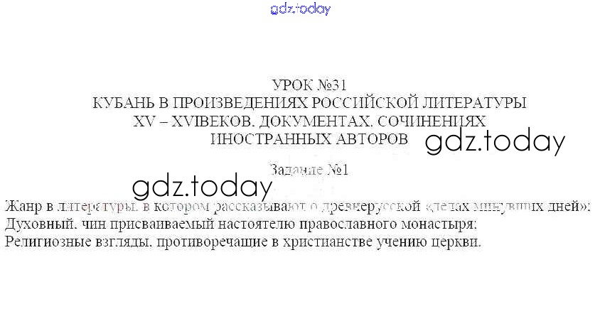 На страницах сайта gdz.today вы найдете учебный и вспомогательный материал, направленный на улучшения знаний школьной программы. ГДЗ - онлайн мир знаний Решение к уроку № 31. Кубань в произведениях российской литературы XV – XVI веков, документах, сочинениях иностранных авторов 1 Рабочей тетради по Кубановедению для 6 класса Голикова, Морозова Традиция 2019