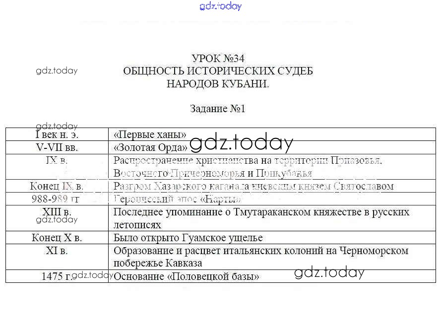 На страницах сайта gdz.today вы найдете учебный и вспомогательный материал, направленный на улучшения знаний школьной программы. ГДЗ - онлайн мир знаний Решение к уроку № 34. Общность исторических судеб народов Кубани 1 Рабочей тетради по Кубановедению для 6 класса Голикова, Морозова Традиция 2019