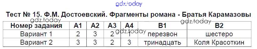 Ответы к Решение к тестам Тест №15. Фрагменты романа - Братья Карамазовы Контрольно-измерительным материалам (КИМ) по Литературе для 6 класса Королева ВАКО 2015