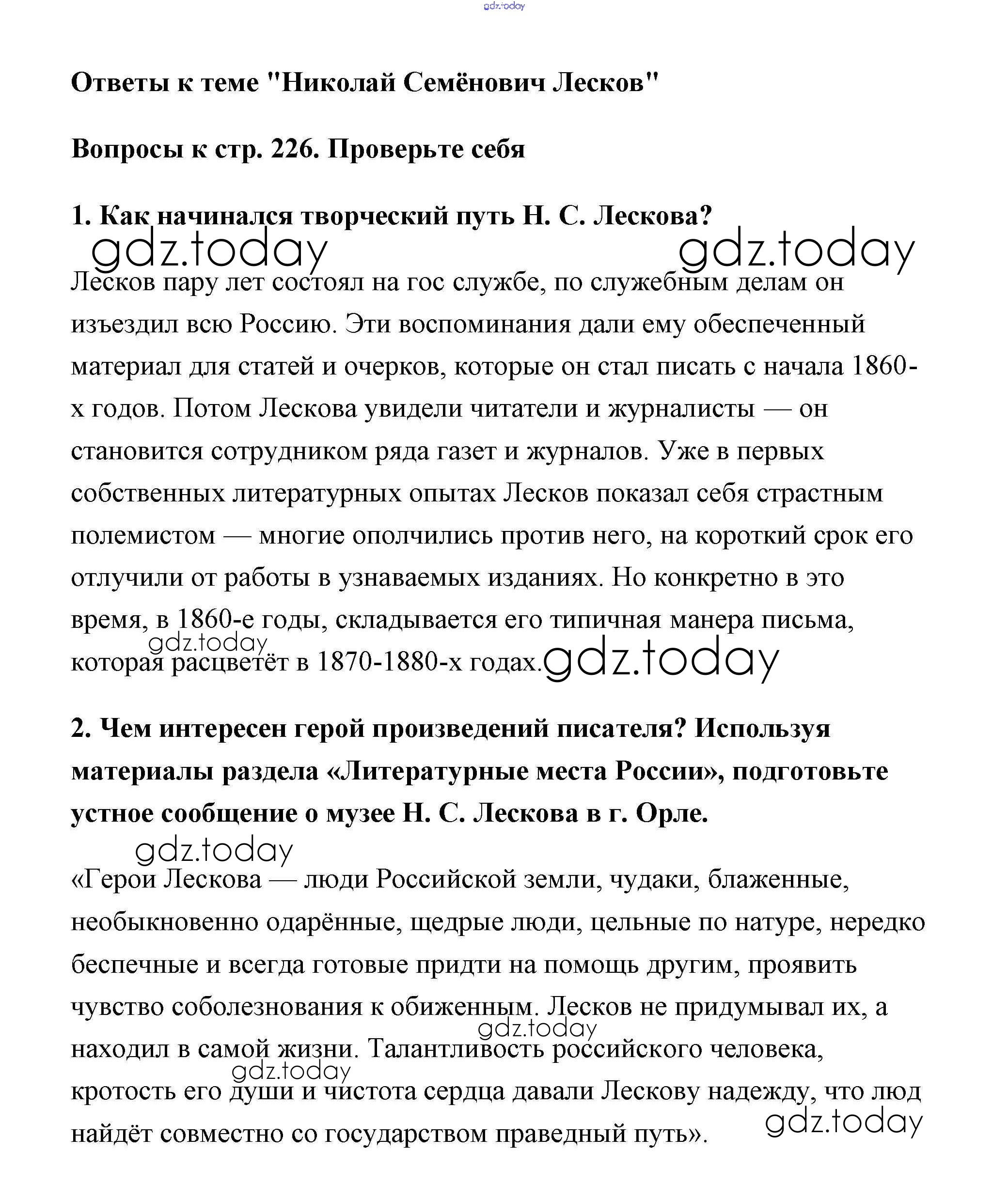 На страницах сайта gdz.today вы найдете учебный и вспомогательный материал, направленный на улучшения знаний школьной программы. ГДЗ - онлайн мир знаний Лесков Решение к части 1 (Новое 16-е издание) страница 226 Учебнику по Литературе для 6 класса Полухина, Коровина Просвещение 2016