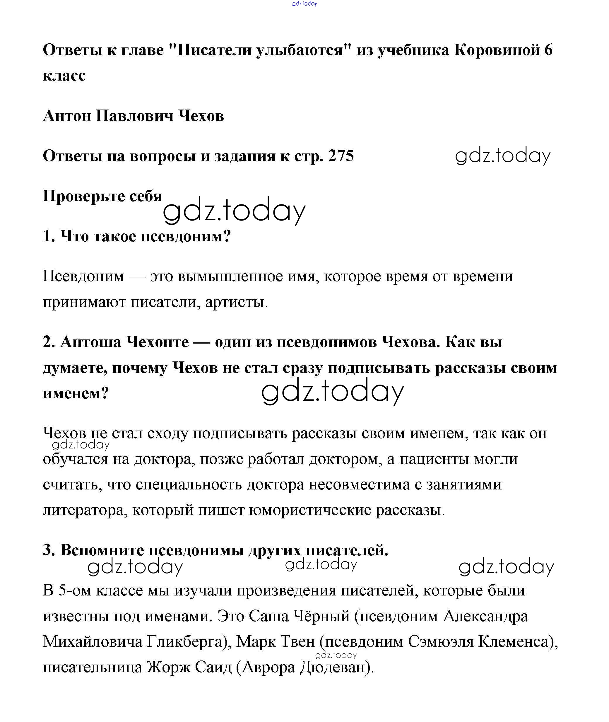 На страницах сайта gdz.today вы найдете учебный и вспомогательный материал, направленный на улучшения знаний школьной программы. ГДЗ - онлайн мир знаний Писатели улыбаются Решение к части 1 (Новое 16-е издание) страница 275 Учебнику по Литературе для 6 класса Полухина, Коровина Просвещение 2016