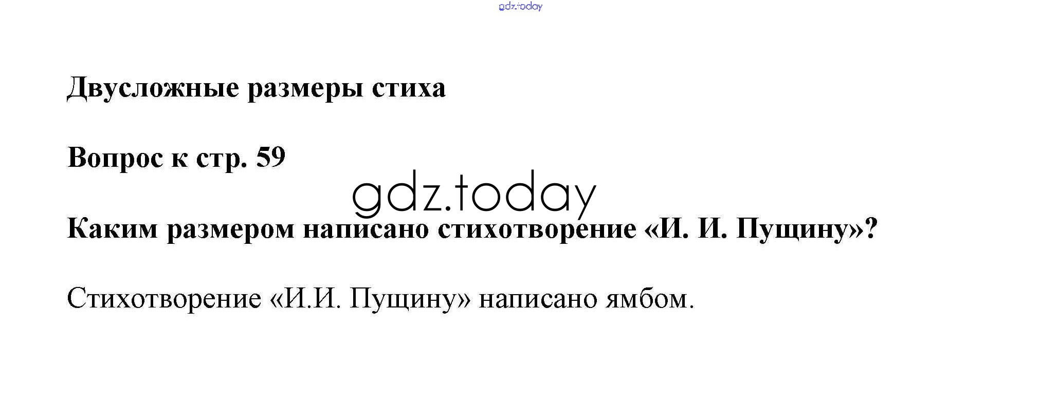 На страницах сайта gdz.today вы найдете учебный и вспомогательный материал, направленный на улучшения знаний школьной программы. ГДЗ - онлайн мир знаний Пушкин Решение к части 1 (Старое 15-е издание) страница 59 Учебнику по Литературе для 6 класса Полухина, Коровина Просвещение 2016