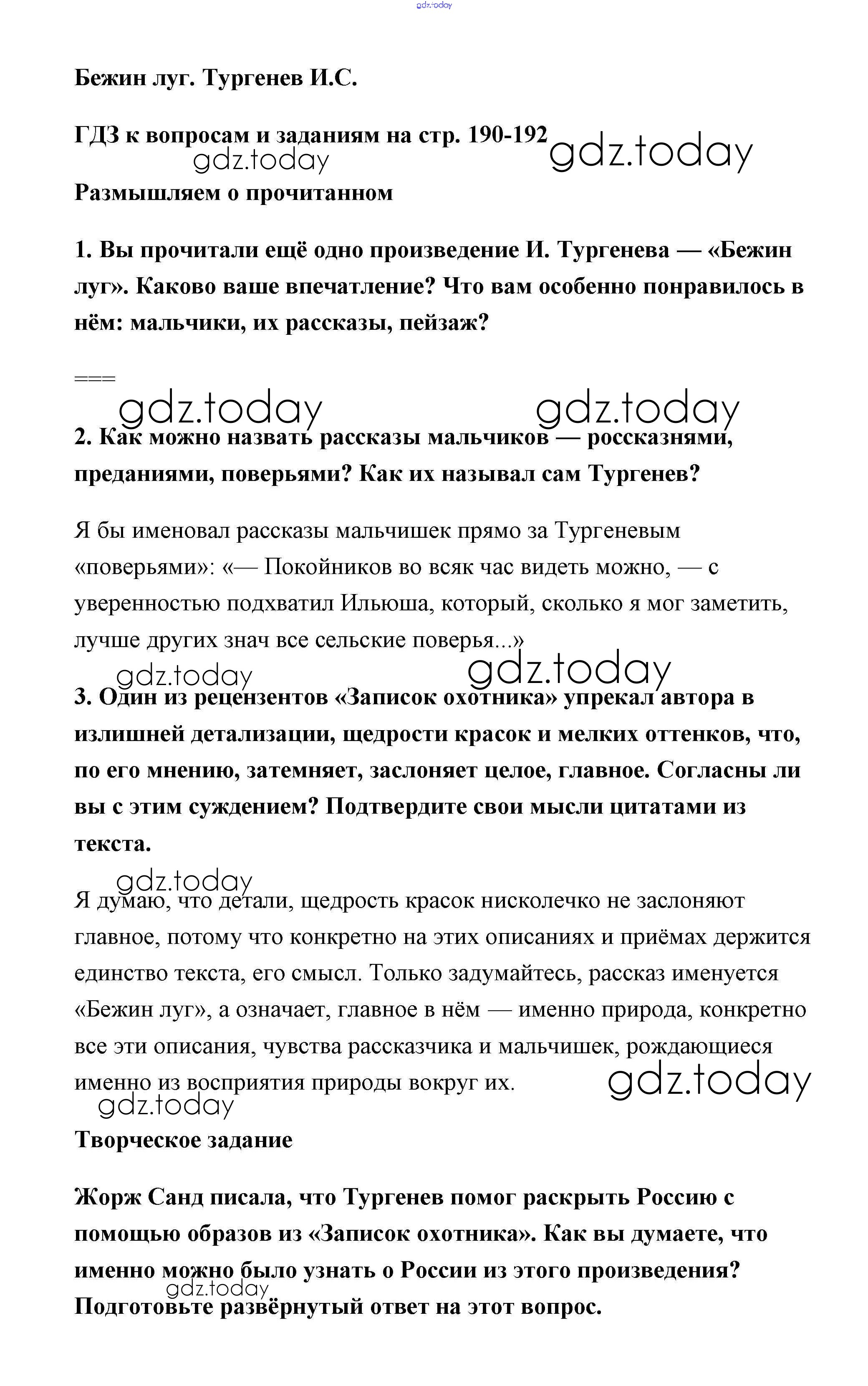 На страницах сайта gdz.today вы найдете учебный и вспомогательный материал, направленный на улучшения знаний школьной программы. ГДЗ - онлайн мир знаний Тургенев Решение к части 1 (Новое 16-е издание) страница 190-192 Учебнику по Литературе для 6 класса Полухина, Коровина Просвещение 2016