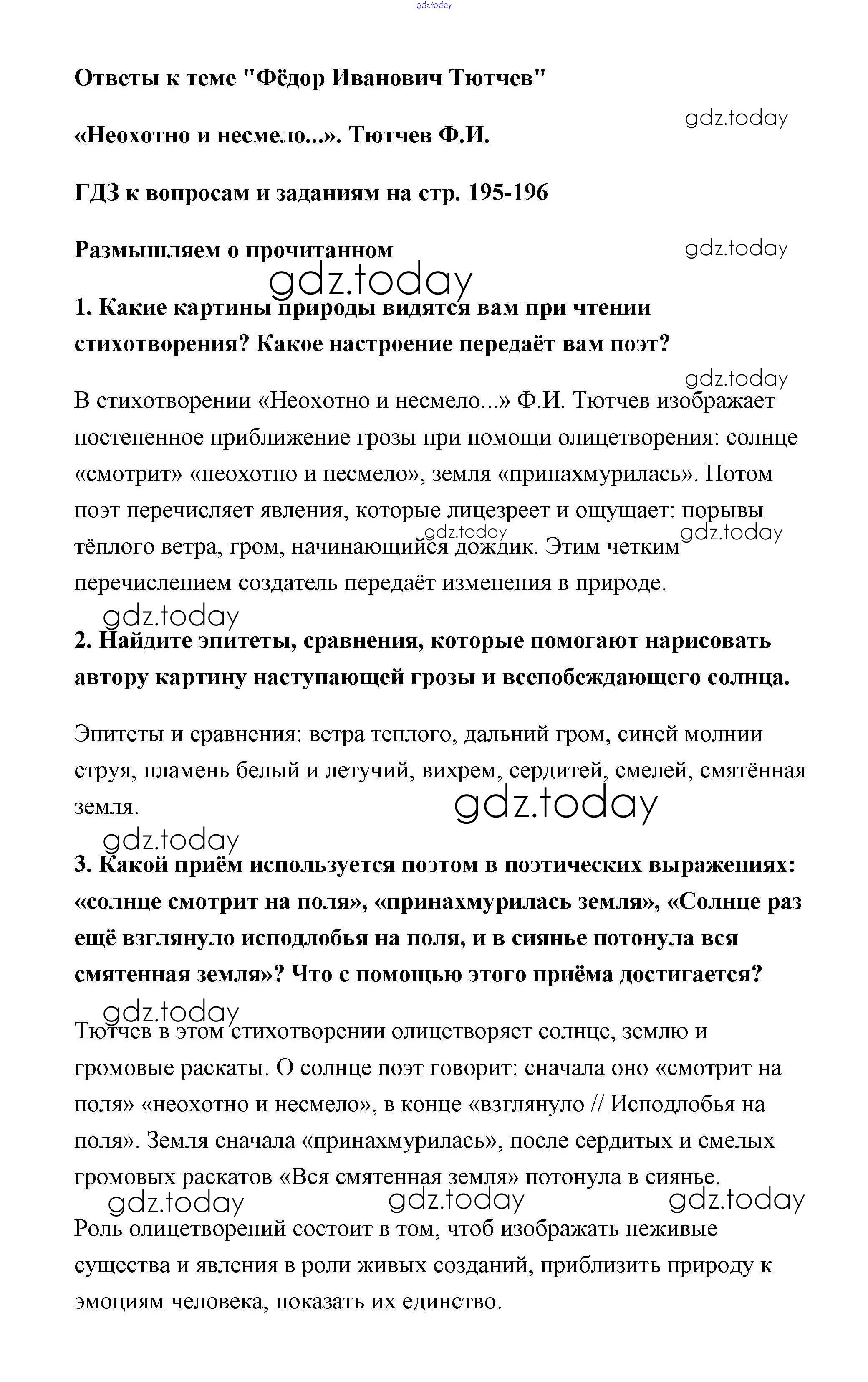На страницах сайта gdz.today вы найдете учебный и вспомогательный материал, направленный на улучшения знаний школьной программы. ГДЗ - онлайн мир знаний Тютчев Решение к части 1 (Новое 16-е издание) страница 195-196 Учебнику по Литературе для 6 класса Полухина, Коровина Просвещение 2016