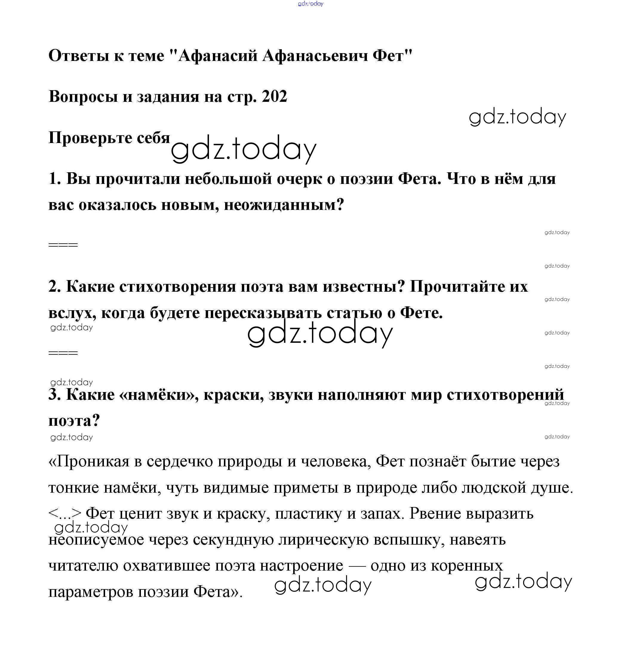 На страницах сайта gdz.today вы найдете учебный и вспомогательный материал, направленный на улучшения знаний школьной программы. ГДЗ - онлайн мир знаний Фет Решение к части 1 (Новое 16-е издание) страница 202 Учебнику по Литературе для 6 класса Полухина, Коровина Просвещение 2016