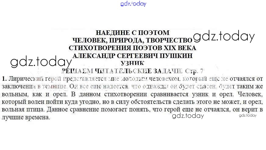 На страницах сайта gdz.today вы найдете учебный и вспомогательный материал, направленный на улучшения знаний школьной программы. ГДЗ - онлайн мир знаний Решаем читательские задачи Наедине с поэтом. Александр Сергеевич Пушкин. Узник 1 Учебнику по Литературе для 6 класса Ланин, Устинова Вентана-граф Алгоритм успеха 2019