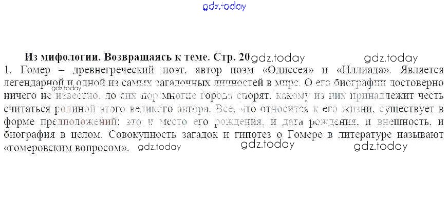 На страницах сайта gdz.today вы найдете учебный и вспомогательный материал, направленный на улучшения знаний школьной программы. ГДЗ - онлайн мир знаний Из мифологии. Возвращаясь к теме, стр. 20 Решение к части 1 1 Учебнику по Литературе для 6 класса Меркин Русское слово Инновационная школа 2016
