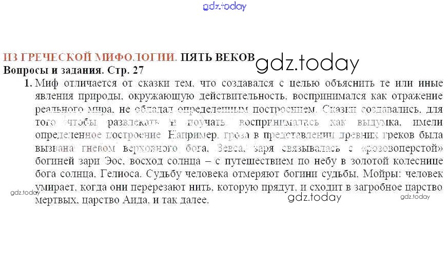 На страницах сайта gdz.today вы найдете учебный и вспомогательный материал, направленный на улучшения знаний школьной программы. ГДЗ - онлайн мир знаний Вопросы и задания, стр. 27 Из греческой мифологии. Пять веков 1 Учебнику по Литературе для 6 класса Меркин Русское слово Инновационная школа 2016