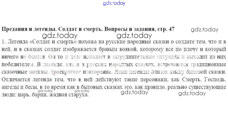 На страницах сайта gdz.today вы найдете учебный и вспомогательный материал, направленный на улучшения знаний школьной программы. ГДЗ - онлайн мир знаний Предания и легенды. Солдат и смерть. Вопросы и задания, стр. 47 Решение к части 1 1 Учебнику по Литературе для 6 класса Меркин Русское слово Инновационная школа 2016