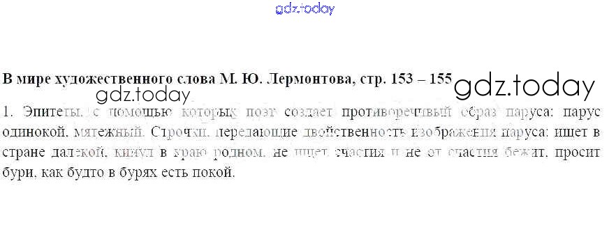 На страницах сайта gdz.today вы найдете учебный и вспомогательный материал, направленный на улучшения знаний школьной программы. ГДЗ - онлайн мир знаний В мире художественного слова М. Ю. Лермонтова, стр. 153 – 155 Парус 1 Учебнику по Литературе для 6 класса Меркин Русское слово Инновационная школа 2016