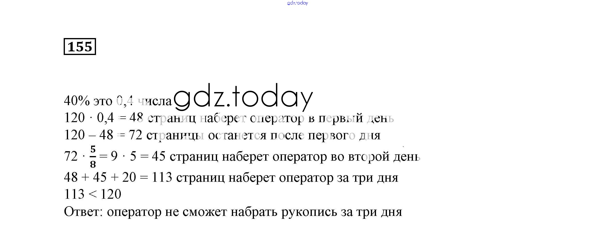 На страницах сайта gdz.today вы найдете учебный и вспомогательный материал, направленный на улучшения знаний школьной программы. ГДЗ - онлайн мир знаний Решение к заданиям 155 Учебнику по Математике для 6 класса Истомина Ассоциация 21 век 2015