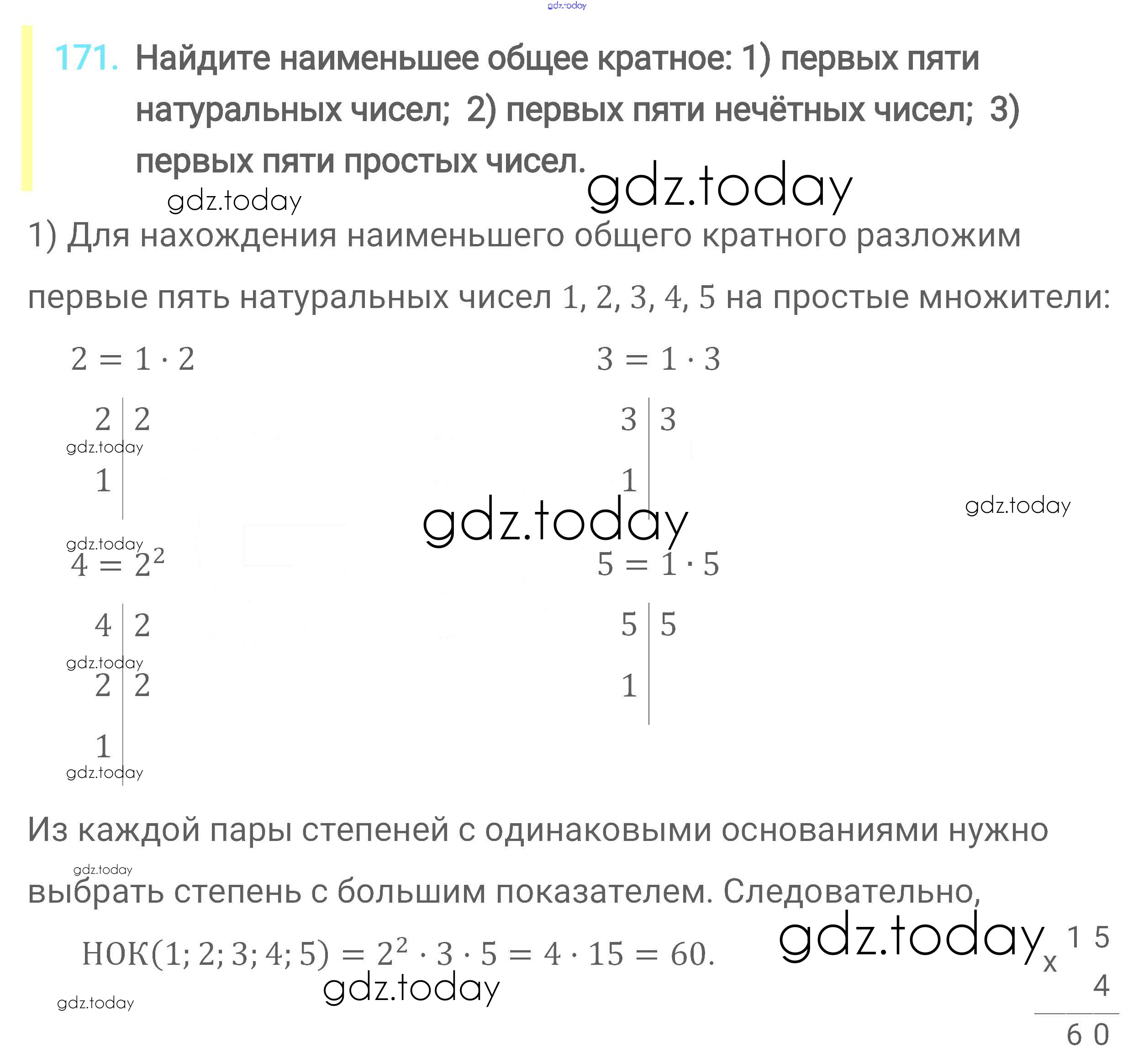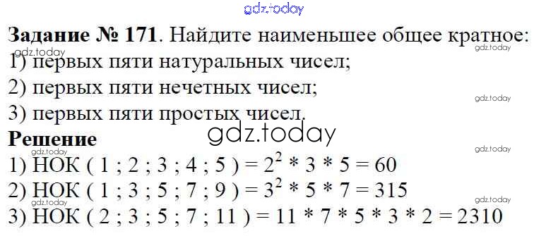 На страницах сайта gdz.today вы найдете учебный и вспомогательный материал, направленный на улучшения знаний школьной программы. ГДЗ - онлайн мир знаний Решение к главе 1. Делимость натуральных чисел (упражнения) 171 Учебнику по Математике для 6 класса Мерзляк, Полонский Вентана-граф Алгоритм успеха 2016
