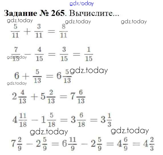 На страницах сайта gdz.today вы найдете учебный и вспомогательный материал, направленный на улучшения знаний школьной программы. ГДЗ - онлайн мир знаний Решение к главе 2. Обыкновенные дроби (упражнения) 265 Учебнику по Математике для 6 класса Мерзляк, Полонский Вентана-граф Алгоритм успеха 2016