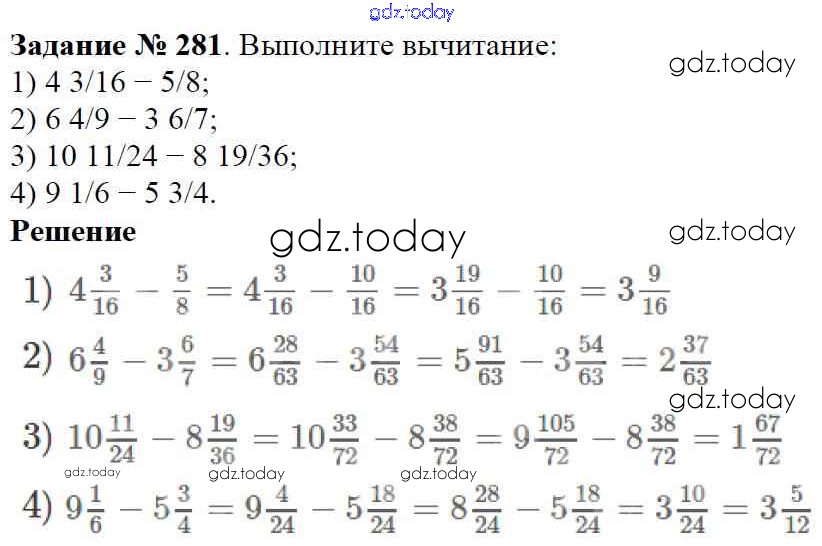На страницах сайта gdz.today вы найдете учебный и вспомогательный материал, направленный на улучшения знаний школьной программы. ГДЗ - онлайн мир знаний Решение к главе 2. Обыкновенные дроби (упражнения) 281 Учебнику по Математике для 6 класса Мерзляк, Полонский Вентана-граф Алгоритм успеха 2016
