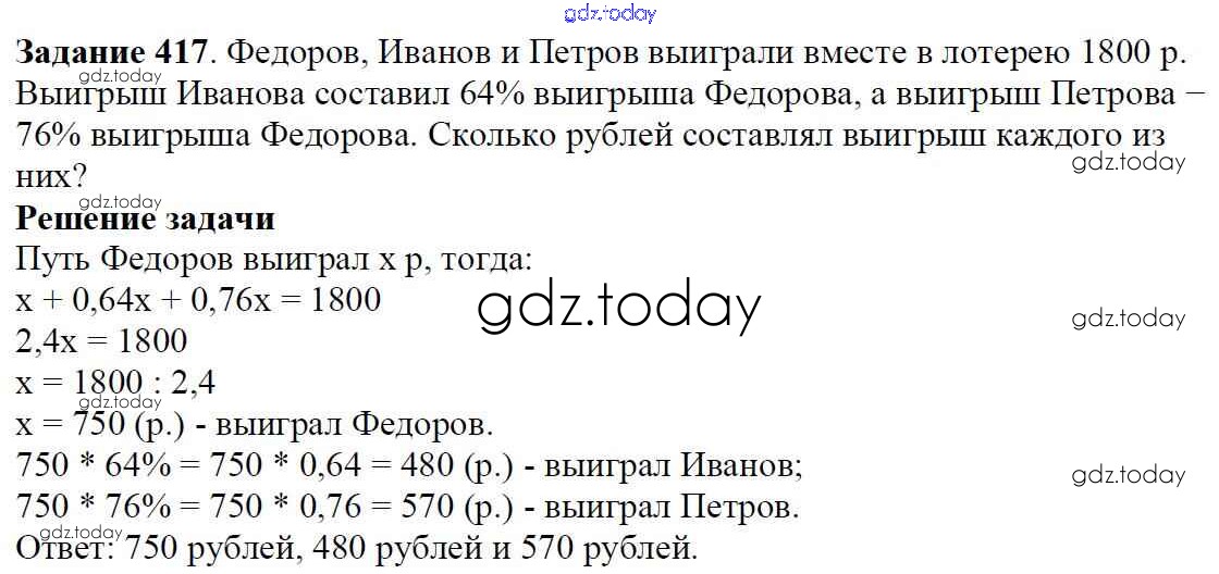 На страницах сайта gdz.today вы найдете учебный и вспомогательный материал, направленный на улучшения знаний школьной программы. ГДЗ - онлайн мир знаний Решение к главе 2. Обыкновенные дроби (упражнения) 417 Учебнику по Математике для 6 класса Мерзляк, Полонский Вентана-граф Алгоритм успеха 2016