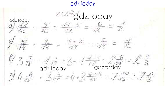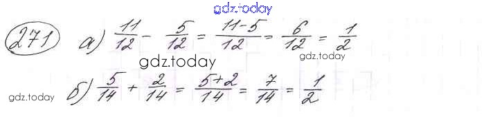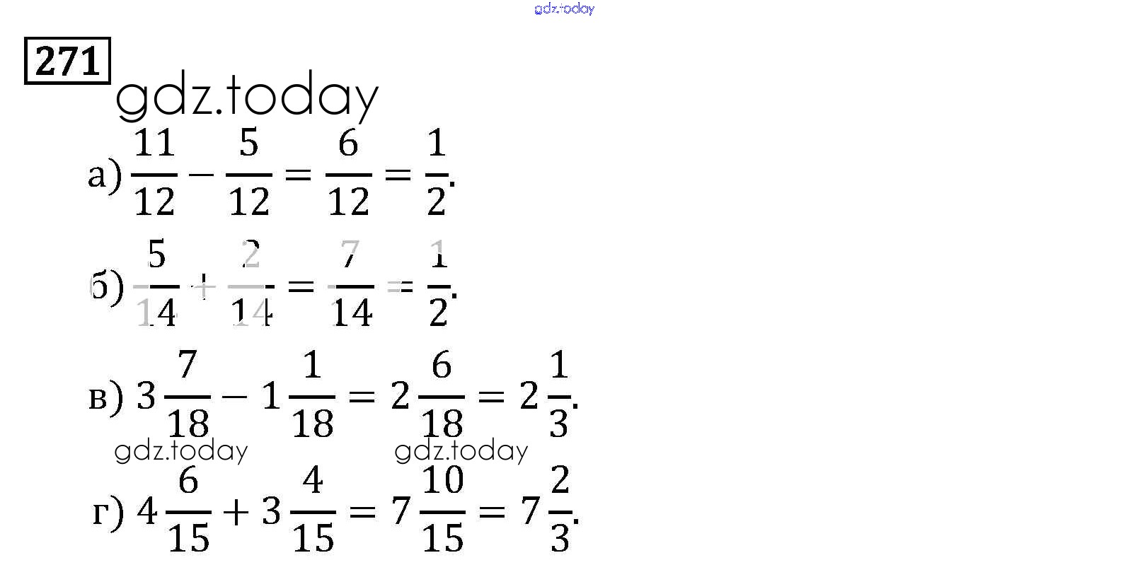 На страницах сайта gdz.today вы найдете учебный и вспомогательный материал, направленный на улучшения знаний школьной программы. ГДЗ - онлайн мир знаний §2. Сложение и вычитание дробей с разными знаменателями Решение к главе 1 271 Учебнику по Математике для 6 класса Виленкин, Жохов Мнемозина 2014