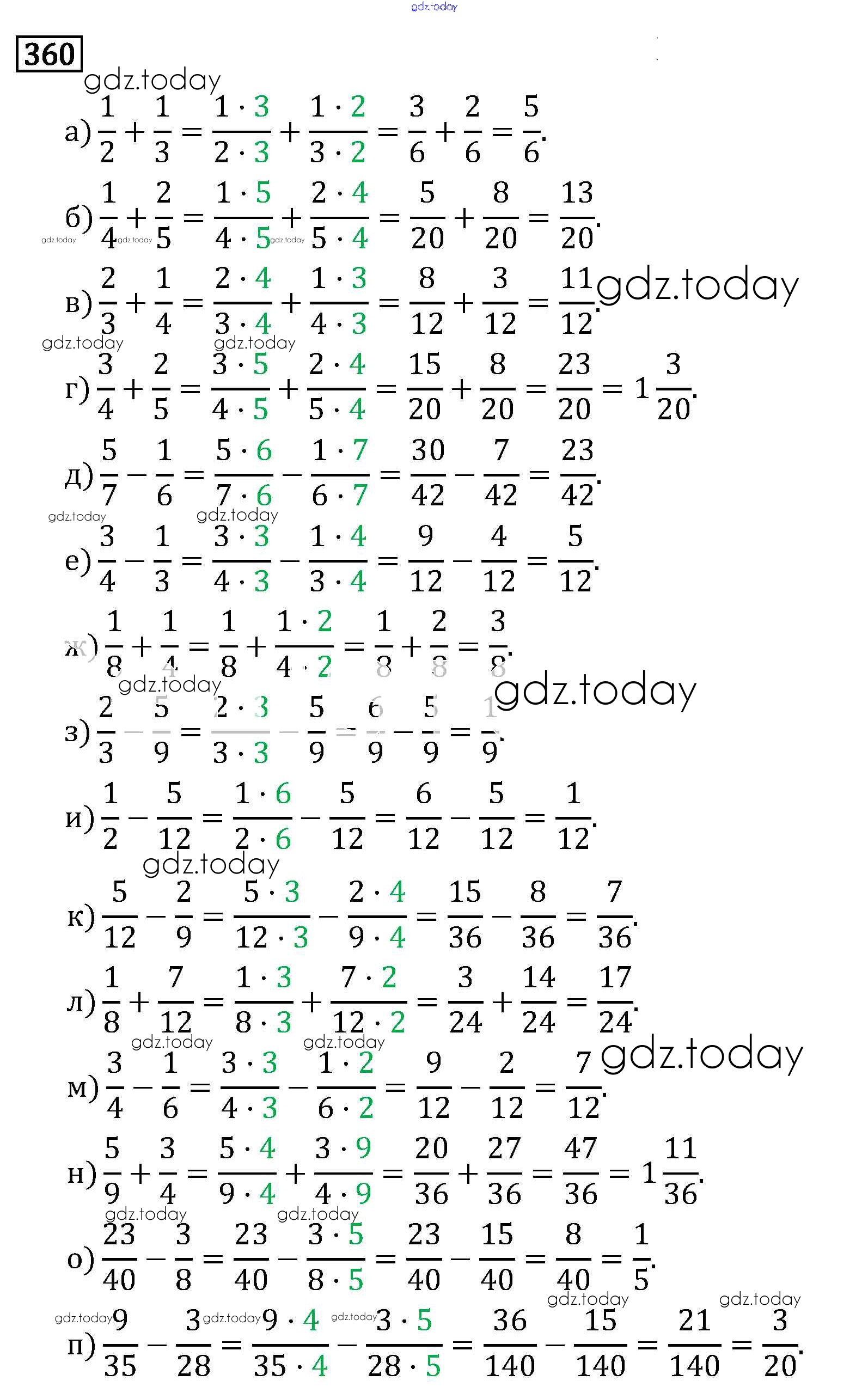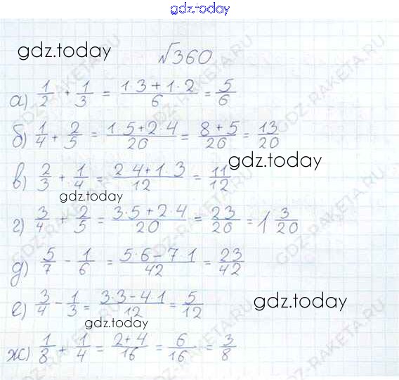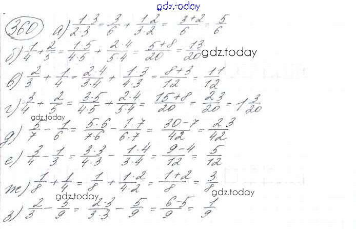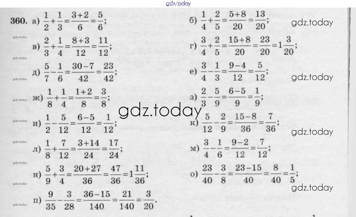 На страницах сайта gdz.today вы найдете учебный и вспомогательный материал, направленный на улучшения знаний школьной программы. ГДЗ - онлайн мир знаний §2. Сложение и вычитание дробей с разными знаменателями Решение к главе 1 360 Учебнику по Математике для 6 класса Виленкин, Жохов Мнемозина 2014