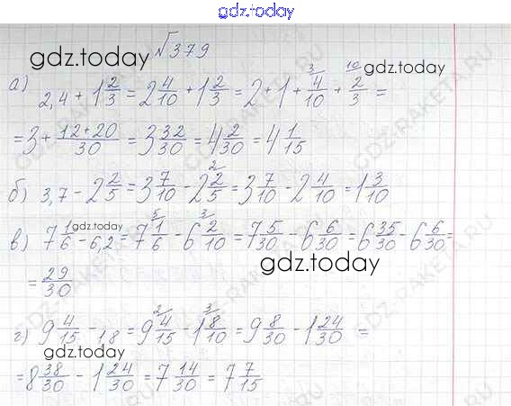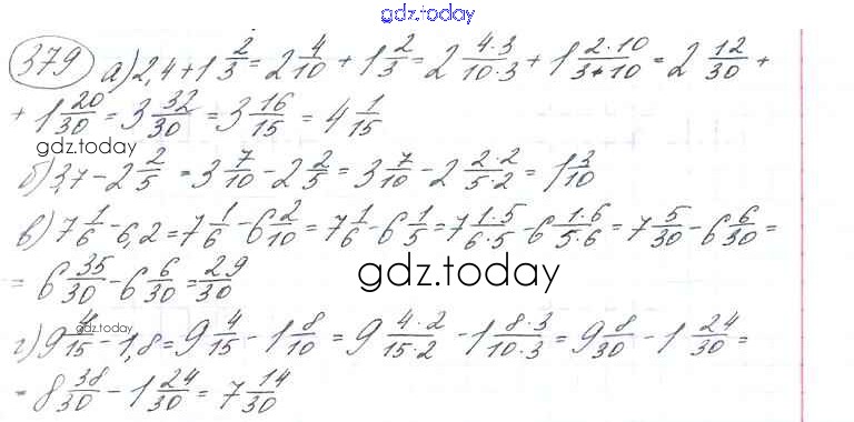 На страницах сайта gdz.today вы найдете учебный и вспомогательный материал, направленный на улучшения знаний школьной программы. ГДЗ - онлайн мир знаний §2. Сложение и вычитание дробей с разными знаменателями Решение к главе 1 379 Учебнику по Математике для 6 класса Виленкин, Жохов Мнемозина 2014
