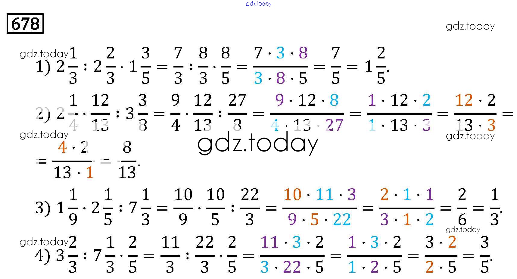 На страницах сайта gdz.today вы найдете учебный и вспомогательный материал, направленный на улучшения знаний школьной программы. ГДЗ - онлайн мир знаний §3. Умножение и деление обыкновенных дробей Решение к главе 1 678 Учебнику по Математике для 6 класса Виленкин, Жохов Мнемозина 2014